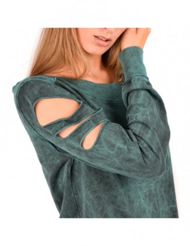 Sudadera no parchada con cortes en el hombro. Lavada individualmente con un tinte especial que ofrece un tacto suave y un porte agradable, así como hace que cada sudadera sea única y un poco distinta a las demás. La mezcla de diferentes colores junto con un intenso trabajo a mano crean este verdadero aspecto vintage