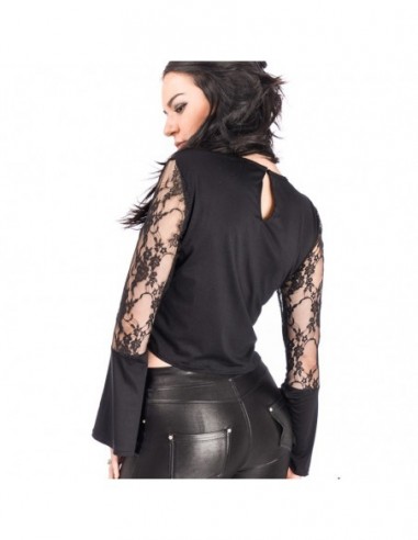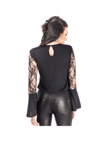 Top de mujer manga larga de encaje que termina de forma acampanada. Escote en forma redonda en tela de encaje sobre otro top negro estampado.
