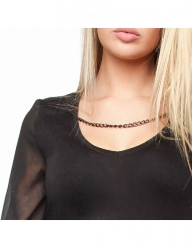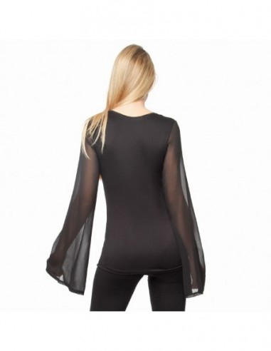 Top de mujer manga larga con manga ancha de chifón , que termina acampanada. El escote asimétrico decorado con una cadena que le le da un look muy elegante.