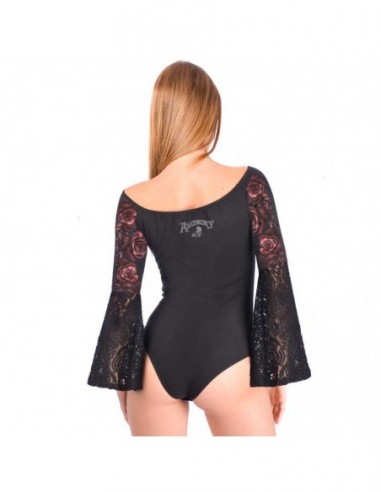 Body de mujer manga larga ancha con un acabado de blonda en la parte final. Lleva un estampado en la parte delantera que se extiende en ambas mangas.
