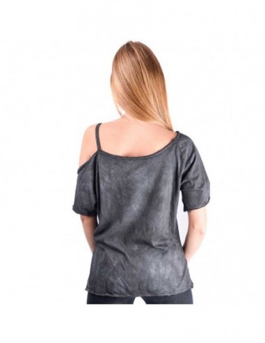 Camiseta holgada de amplio cuello a barco que ofrece un tacto suave y un porte agradable.Lleva un tirante fino en la parte izquierda de la prenda dejando el hombro descubierto. El acabado final sobre la prenda le garantiza un look extraordinario y vintage
